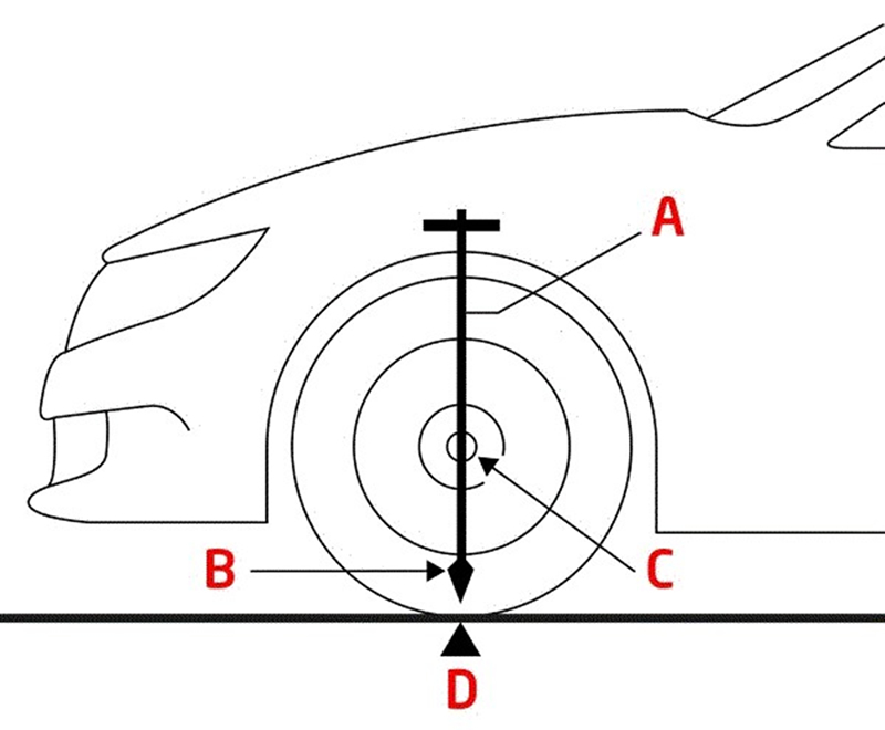 - 1-Colgar un trozo de cuerda (A) con un cono (B) en el vehículo de modo que la cuerda pase por el centro (C) de las ruedas. Marcar en el suelo el punto al cual apunta el cono (D). Repetir esto mismo para todas las ruedas (imagen 1).