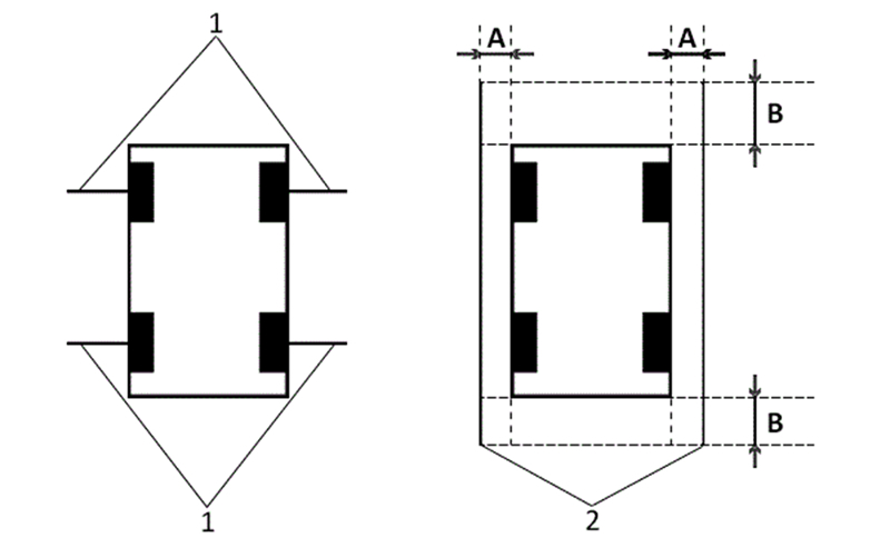 - 2-Coloque un trozo de cinta longitudinal con el vehículo a 30 cm del vehículo (véase la imagen 1, objetos 2 y A). La longitud debe ser igual a la longitud del vehículo + 1 metro delante y otro detrás de este (véase la imagen 1, objetos 2 y B).